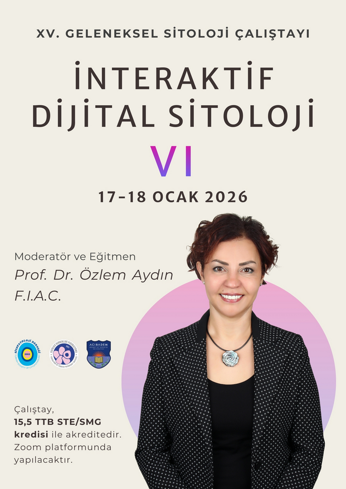 Moderatörlüğü ve Eğitmenliği Prof. Dr. Özlem Aydın tarafından yapılacak olan XV. Geleneksel Sitoloji Çalıştayı - İnteraktif Dijital Sitoloji VI, 17-18 Ocak 2026 tarihinde çevrimiçi gerçekleştirilecektir.
